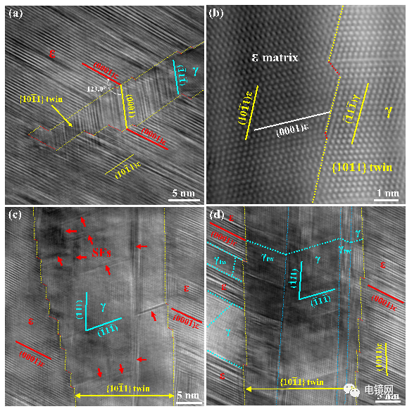 图1 {101}纳米孪晶内部发生hcp → fcc逆剪切转变。