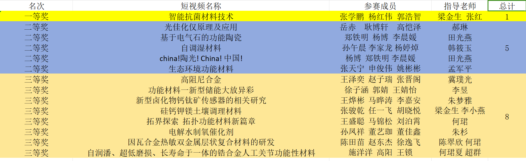 《第一届全国大学生功能材料短视频大赛于 2024年举办,《第一届全国大学生功能材料短视频大赛》组委会共收到来自国内46所高校的324份作品,yl23455永利集团在大赛中表现突出,1人获得一等奖,5人获得二等奖,8人获得三等奖!总体获奖情况在参赛高校中名列前茅。