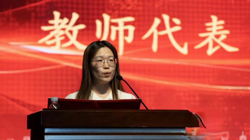 成型242班班导师研究生导学团队兼职辅导员韩露作为教师代表向新生们分享了自己作为老师的心得体会她勉励全体新生进入大学阶段要尽快完成角色转换,确立未来目标勤奋踏实努力,练就健康身心以及学会面对挫折。期望全体新生能够成为具有“家国情怀、全球视野、创新精神、实践能力”的卓越人才