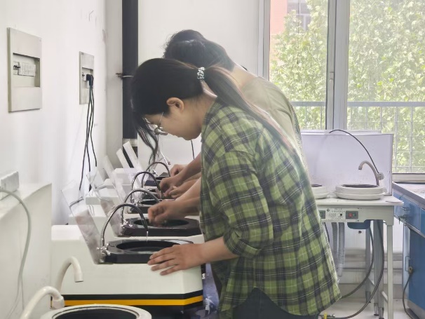 本轮比赛分为机磨球铁和手磨纯铁两个项目。第一场由五名选手进行机磨,五名选手进行手磨,并于第二场互换,排名通过比较两场比赛总分得出。参赛选手积极备赛,赛场上精神饱满、沉着冷静。认真完成磨制、抛光、腐蚀、显微镜观察等工序,最终制备出供评委评分的金相样品。