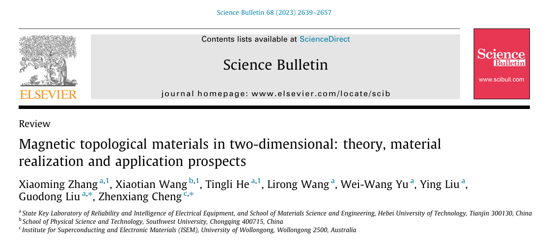 二维磁性拓扑材料将二维磁性与非平庸拓扑能带特点完美融合,不仅丰富了凝聚态物理的理论体系,也在能源、电子学及信息技术等领域上展现出了巨大应用前景。张小明教授与西南大学王啸天副教授、澳大利亚卧龙岗大学程振祥教授合作,对二维磁性拓扑材料的最新进展进行了全面总结,系统地阐述了二维磁性拓扑材料的基本理论、研究进展、材料实现、潜在应用和未来挑战。该工作于2023年11月,以综述形式发表在国产旗舰期刊Science Bulletin(DOI: 10.1016/j.scib.2023.09.004)上。论文第一作者为张小明教授,西南大学王啸天副教授、我校博士研究生何婷丽为共同第一作者,我校刘国栋教授和卧龙岗大学程振祥教授为论文通讯作者。