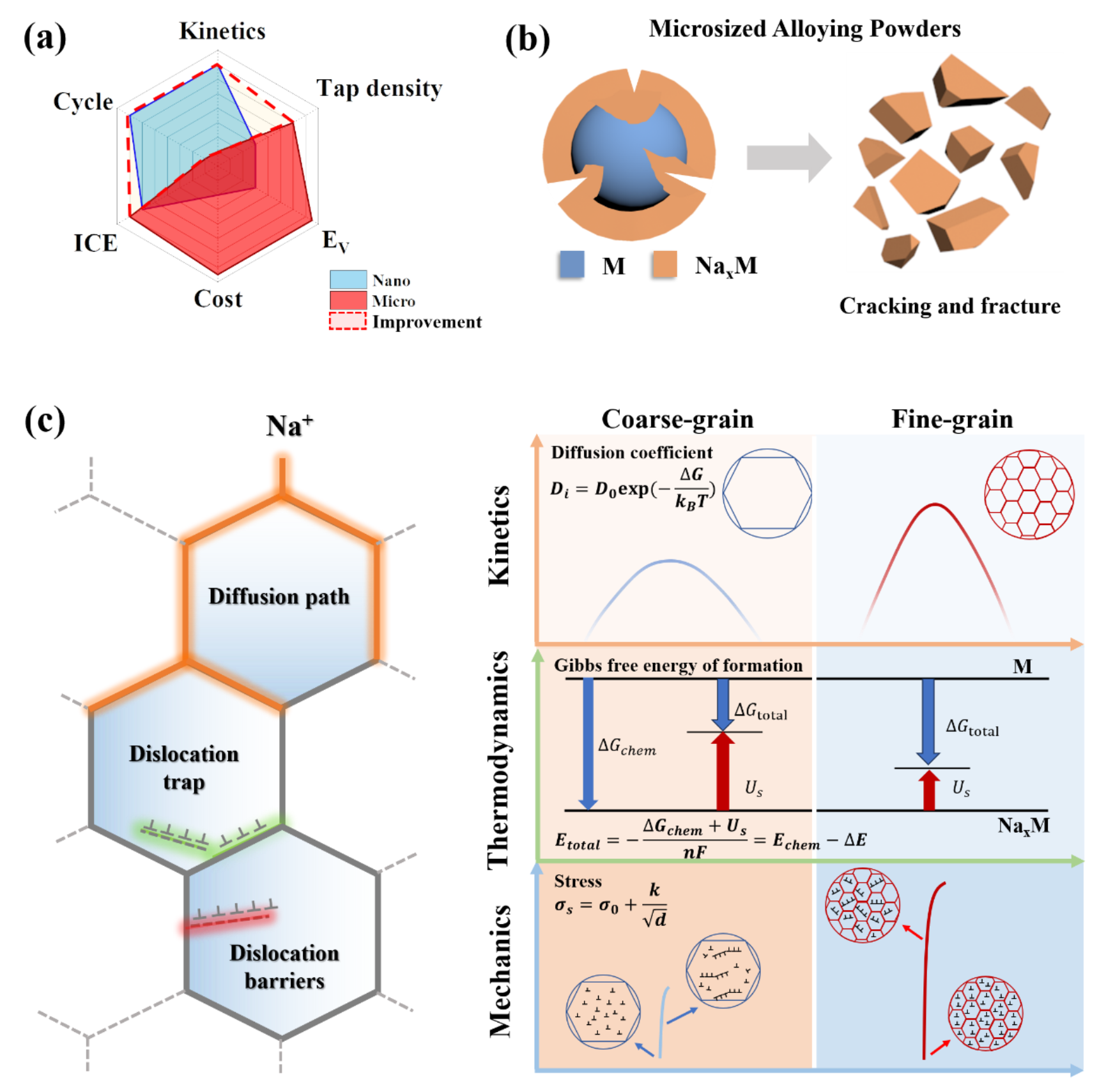 图1 用于SIB的微尺寸合金负极的GBs工程示意图。a,纳米和微米级负极材料的指标比较(ICE表示初始库仑效率,Ev表示体积比能量密度)。b,传统微尺寸合金负极在储钠过程中的问题和失效机制。c,从动力学、热力学和力学方面分析了GBs在电化学应力分散过程中对储钠性能的影响。