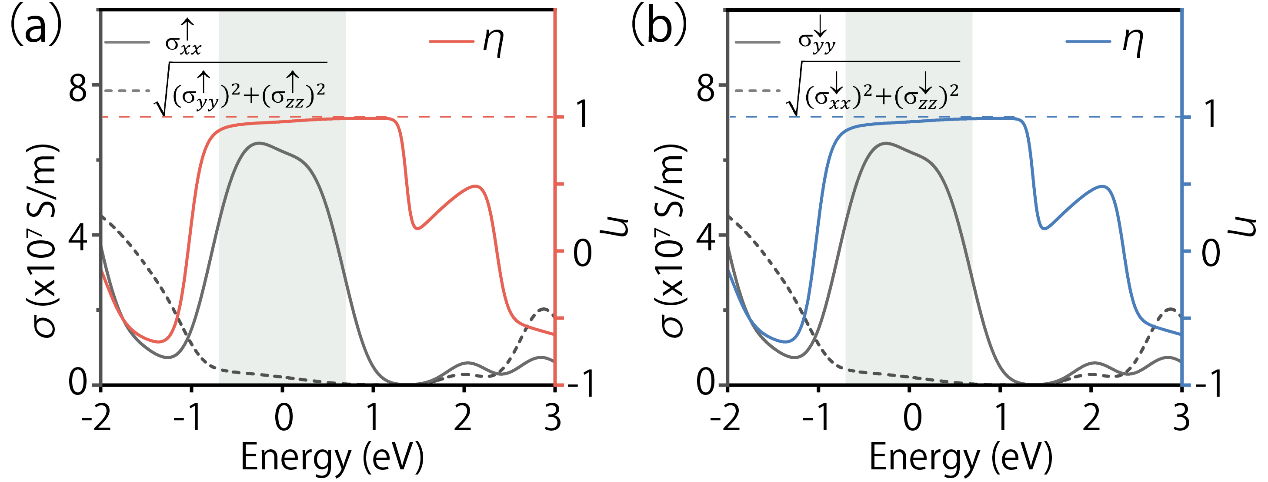。更重要的是每个自旋通道中的电子电导率的各向异性在节线网(费米能级)附近极大增强,其中![]()
