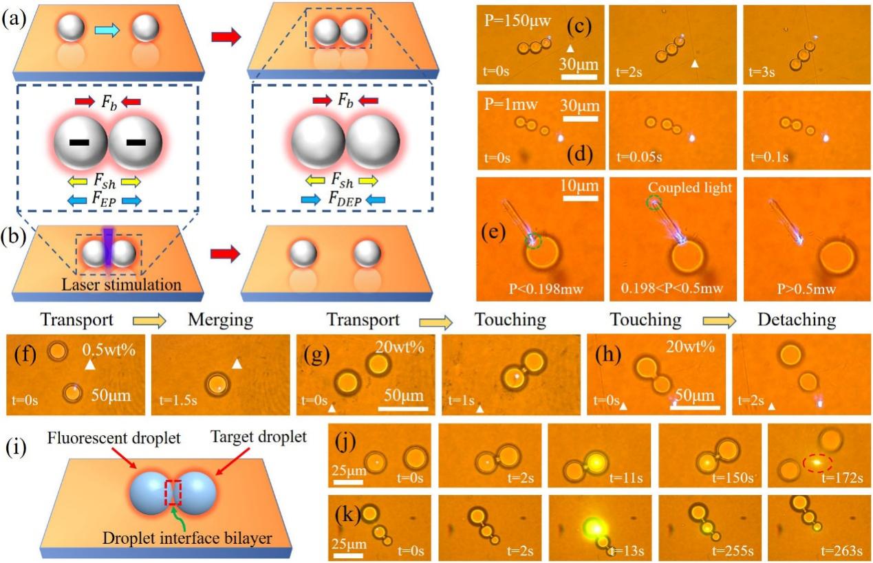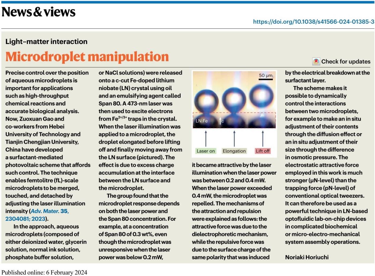 光子微流控芯片集生物培养、输运及检测功能于一体,可快速、高效地实现对单细胞的操控、分类和检测分析。yl23455永利集团阎文博研究员团队提出的表面活性剂辅助的光伏微流体操控技术,可实现飞升体积水合微液滴在油相中的复杂操控与组装。该技术既不需要外部电源供电也不需要复杂电极制备,显著优于数字电路驱动的传统微流控技术,与光镊操控相比,该技术具有作用力强、所需光功率低、可串/并行切换、可非局域调控等优点,从而使得铌酸锂基光子微流控芯片、微机电系统的设计与制备成为未来光子学发展的一个新方向。基于以上研究成果,阎文博研究员团队在顶级期刊《Advanced Materials》上发了表题为“Efficient Surfactant-Mediated Photovoltaic Manipulation of fL-Scale Aqueous Microdroplets for Diverse Optofluidic Applications on LiNbO3 Platform”( 原文链接:https://doi.org/10.1002/adma.202304081)高水平论文。yl23455永利集团省部共建电工装备可靠性与智能化国家重点实验室为论文第一完成单位,阎文博研究员为论文唯一通讯作者,其博士研究生为论文第一作者。该工作一经发表便引起了学界的广泛关注,《Nature Photonics》资深编辑Noriaki Horiuchi在News & views栏目中对该工作进行重点专题推介(原文链接:https://doi.org/10.1038/s41566-024-01385-3)。