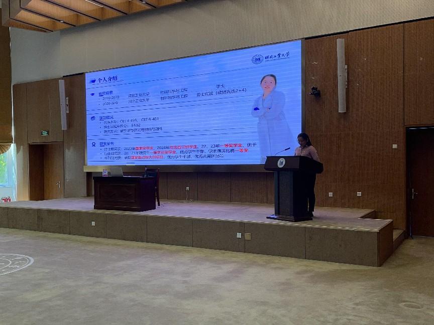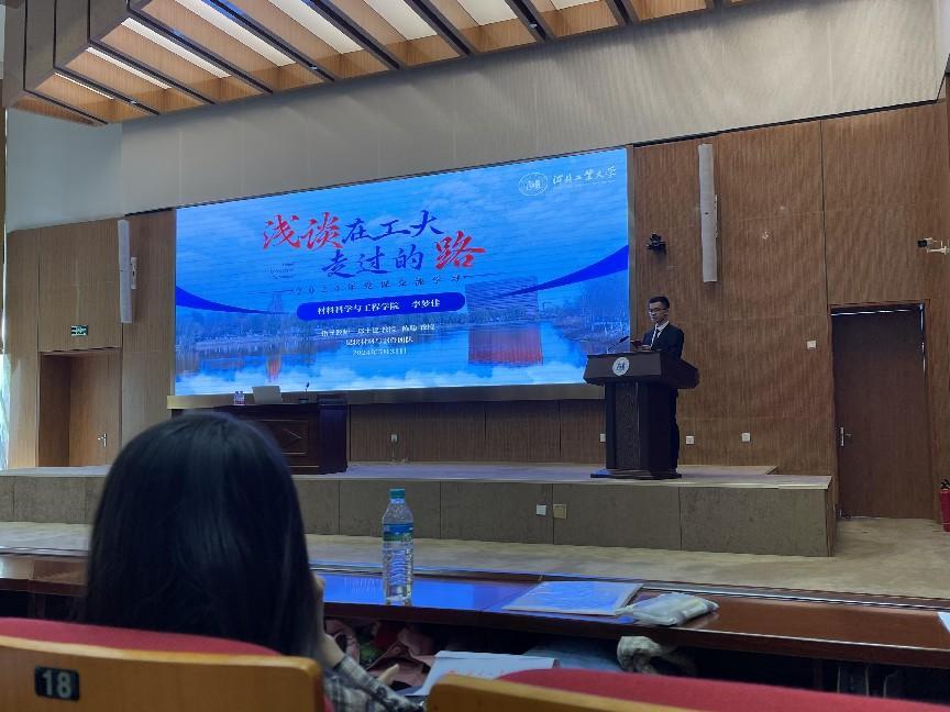 李梦佳主要从“思想篇——全面提升素质,一直向党前行”、“科研篇——热爱专业探索,一心琢磨研究”和“实践篇——传承工大精神,一段青春遇工大”三个方面为同学们展开分享。