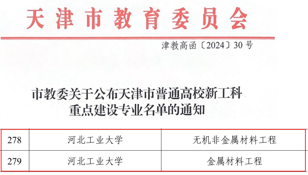 近日,天津市教育委员会印发了《市教委关于公布天津市普通高校新工科重点建设专业名单的通知》,公布天津市普通高校新工科重点建设专业名单,yl23455永利集团无机非金属材料工程专业和金属材料工程专业2个现有工科专业获批天津市普通高校新工科重点建设专业。