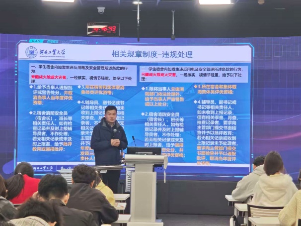 高老师首先阐述了学习消防安全知识的重要意义,结合近年来的火灾数据统计,强调了“预防为主”的核心原则。讲座内容系统全面,涵盖了宿舍违规电器使用、电动车火灾隐患、充电宝(特别是三元锂电池)安全风险等校园常见消防问题,并通过播放真实火灾案例视频,给予了师生强烈的视觉冲击和警示。