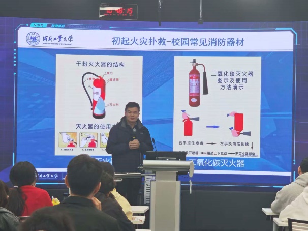 此外,高老师还重点讲解了实验室消防安全注意事项,梳理了宿舍与实验室的重点隐患,并宣导了学校相关的消防安全管理制度。最后,他详细介绍了常见消防器材的使用方法、疏散逃生自救技巧,并再次明确了校园24小时报警电话。