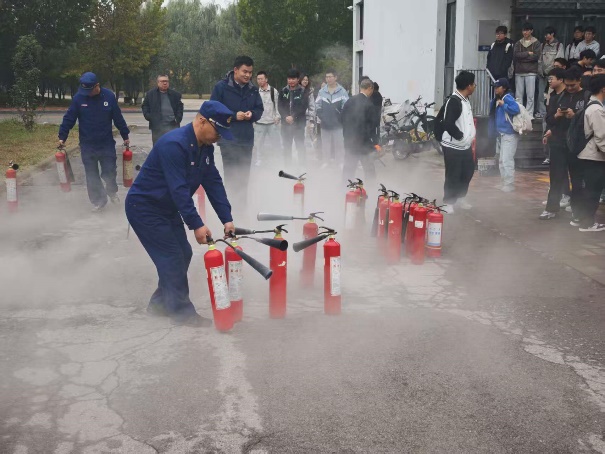 理论环节结束后,全体参训师生转移至C区北侧路边指定区域进行实操演练。安全工作处的老师现场讲解了干粉灭火器的使用要点——“提、拔、握、压”,并进行了标准示范。