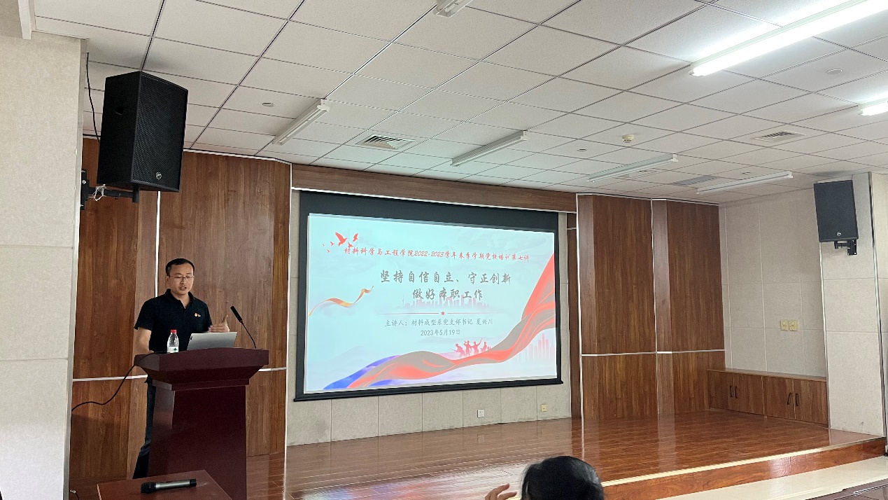 2023年5月19日下午2:00,材料成型系党支部书记夏兴川以“坚持自信自立、守正创新——做好本职工作”为主题,为我院近百名入党积极分子讲授党课,加深同学们对党的二十大的理解。党课由学院组织员杨璐一主持。