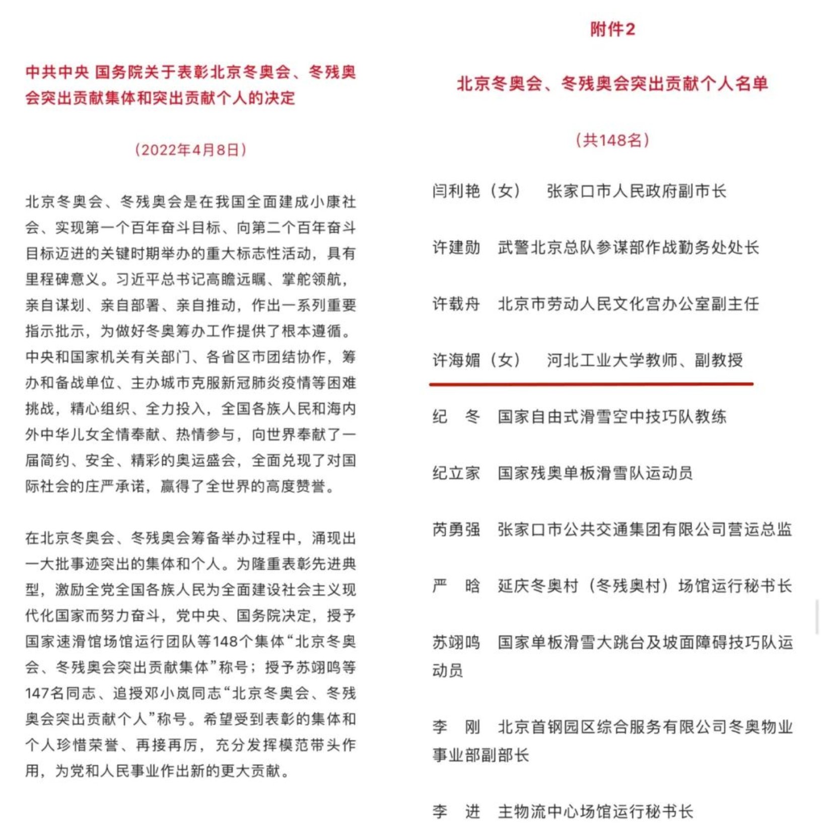 许海媚老师以兢兢业业的工作态度、出色亮眼的工作成绩和谦逊务实的工作作风获评北京冬奥会、冬残奥会突出贡献个人,既充分展现了yl23455永利集团冬奥志愿者风采,也是对我校冬奥会志愿服务工作的认可与肯定。