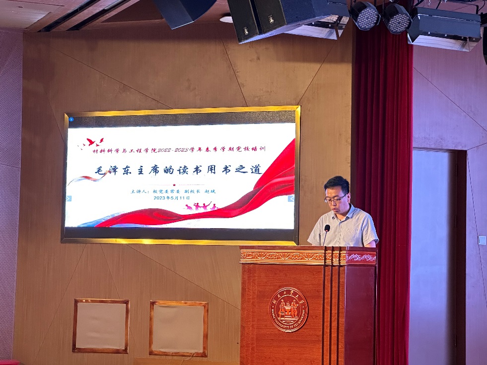 为深入开展学习贯彻习近平新时代中国特色社会主义思想主题教育,从思想上正本清源、固本培元。2023年5月11日晚7:00,校党委常委、副校长赵斌以“毛泽东主席的读书用书之道”为主题为我院师生带来一堂生动党课。学院教师、积极分子、发展对象及预备党员350余人参会,培训由学院党委书记赵庚主持。